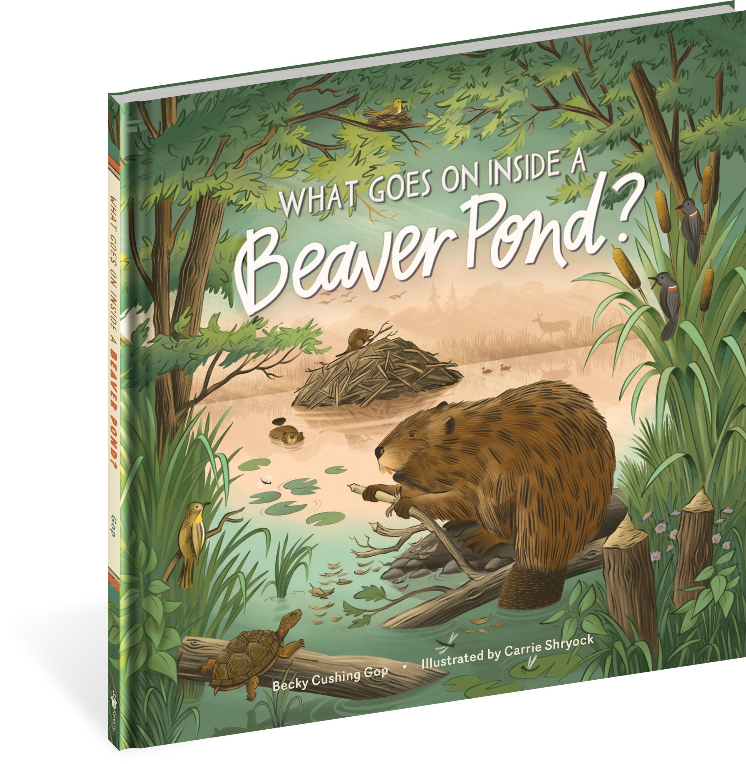 What Goes on inside a Beaver Pond? takes kids ages 8 to 10 on a journey through a year in the life of a young beaver (called a “kit”). This is an exciting year as the young beaver leaves her family lodge and moves throughout the Yokun Brook waterways, seeking a new home for herself. Throughout the seasons, vibrant illustrations and descriptions reveal the hidden inner-workings of a beaver lodge, how beavers fell trees with their teeth and create a wetland habitat, how they collect food and ward off predators, and what daily life is like within a beaver colony. Educational side panels enhance the story with details about beaver behavior and anatomy, as well as information about what other animal inhabitants of the pond are up to throughout the year. Author Becky Cushing Gop is an environmental educator and director of Mass Audubon’s Pleasant Valley Wildlife Sanctuary where the story takes place. Nature illustrator Carrie Shryock’s lively and charming graphics bring the young beaver’s story to life for nature-curious kids.
