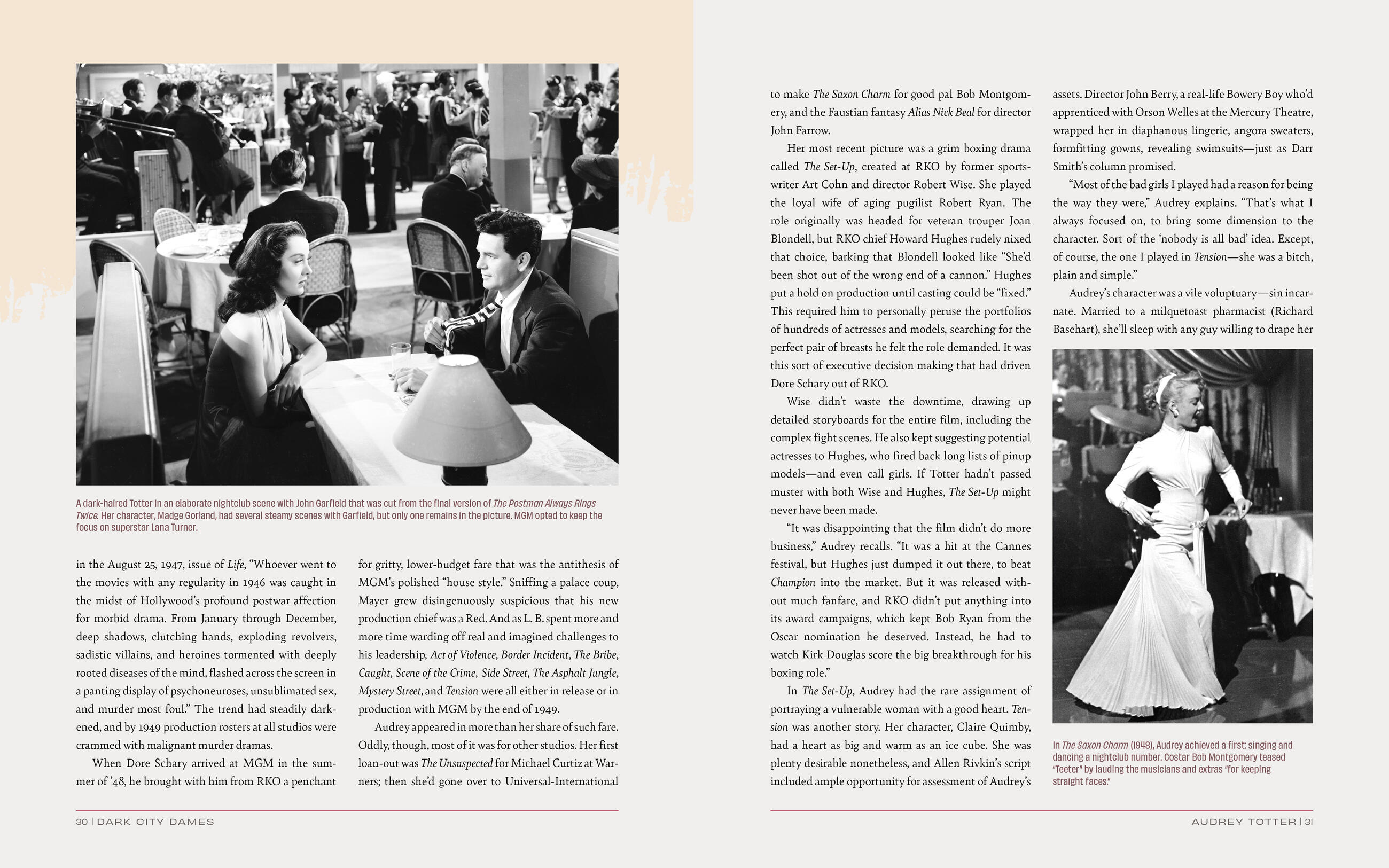The book provides in-depth profiles of these formidable women during the height of their careers, circa 1950, as they balanced love and career, struggled against typecasting, and sought fulfillment in a ruthless business. Their personal stories—teeming with larger-than-life characters like Howard Hughes, Louis B. Mayer, Robert Mitchum, Otto Preminger, and John Huston—offer a fascinating counterpoint to their movies. Then Dark City Dames revisits each woman fifty years later, to witness their hard-won—and triumphant—survival. On every page their own voices ring through, reflecting on their lives with as much passion, pain, intelligence, energy, and humor as any movie script.