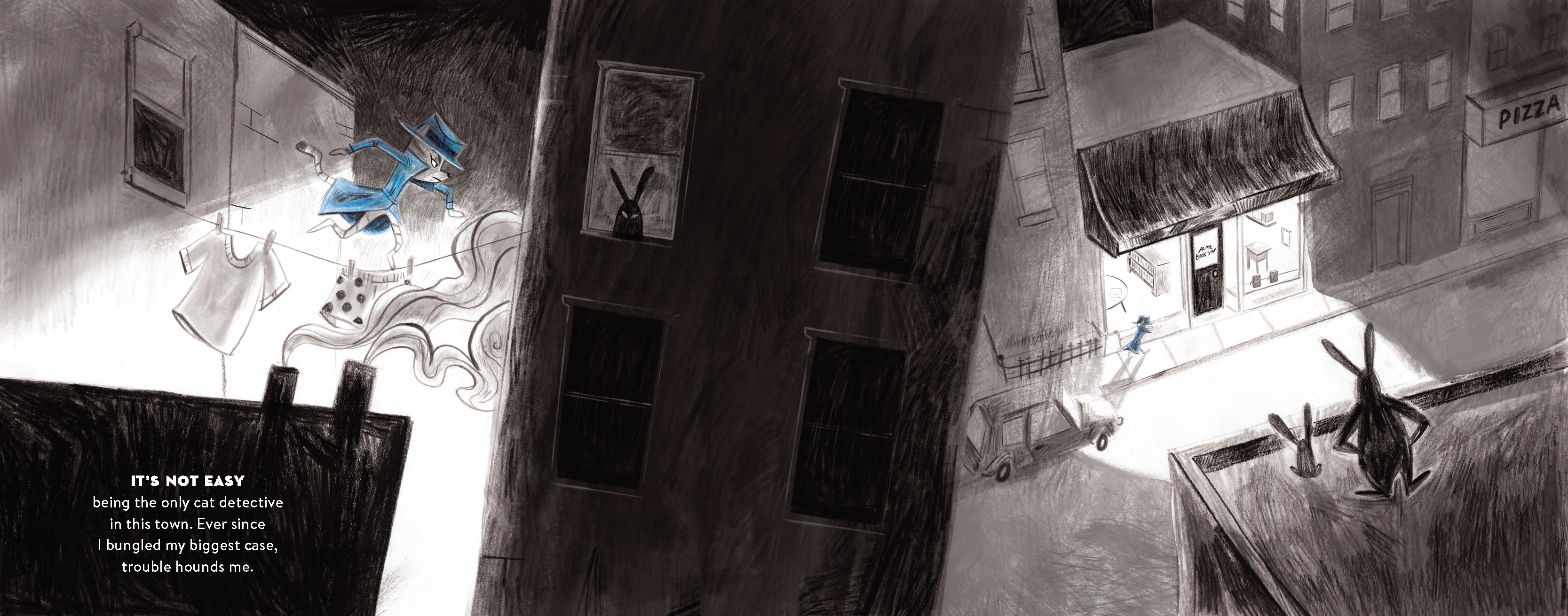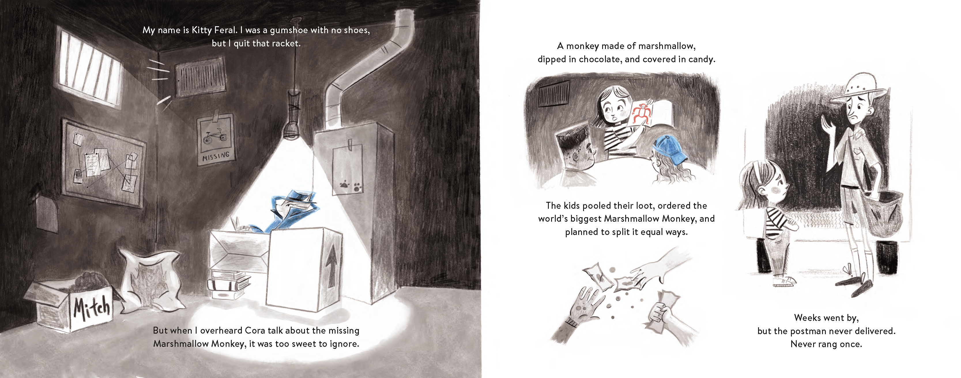 Dangerous denizens lurk around every dark corner as Kitty searches for clues in bookstores, alleyways, rooftops, and waterfronts. Who made off with the majestic Marshmallow Monkey (inspired by none other than the Maltese Falcon)? Where is the beloved Mitch the Mutt? Kitty’s got plenty of questions and not enough answers! Follow along through a tangled web of crime and intrigue as Kitty tries to solve the case.
