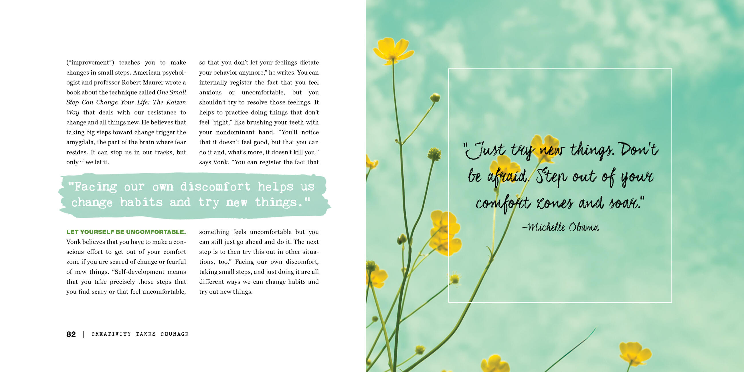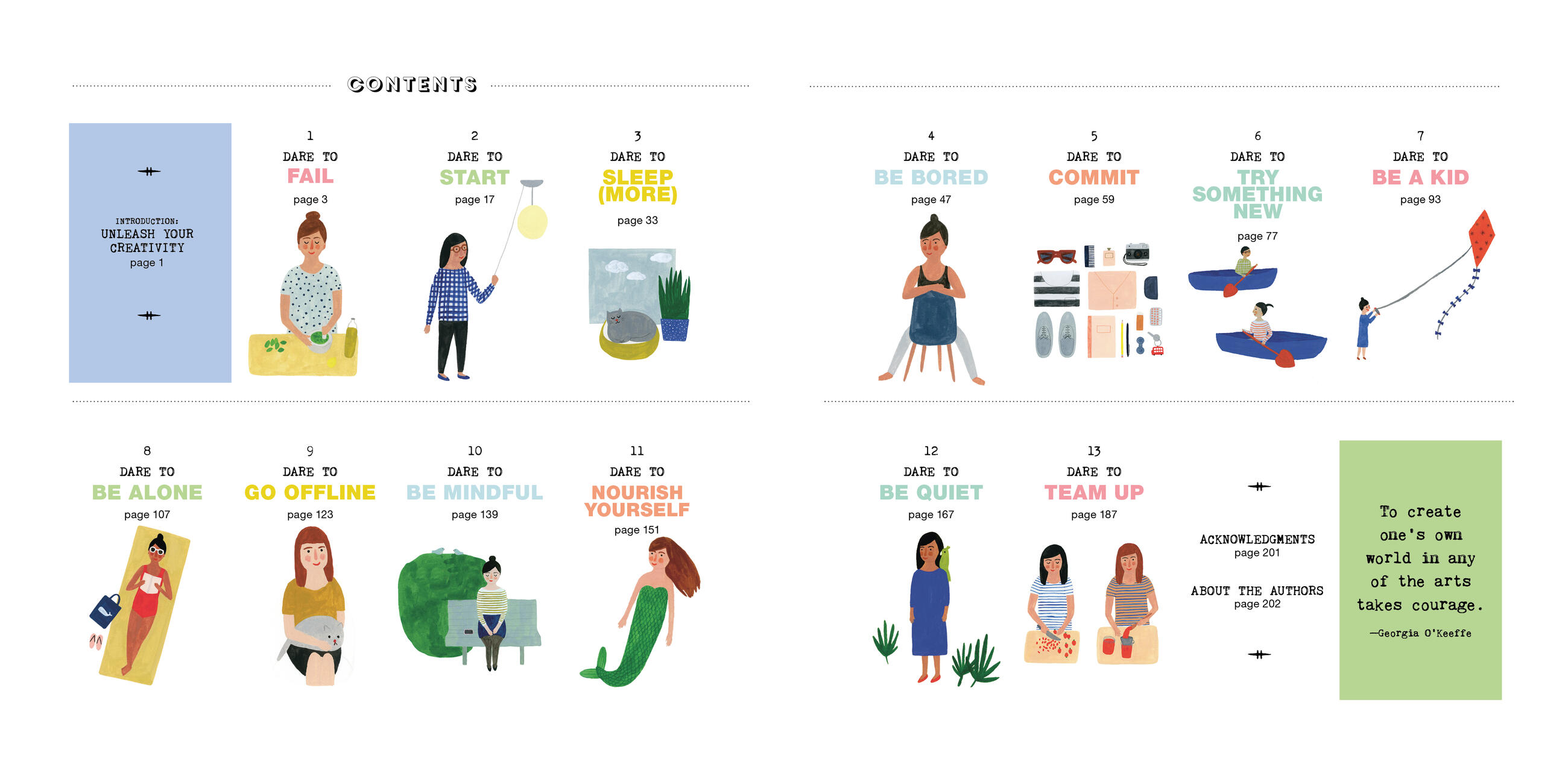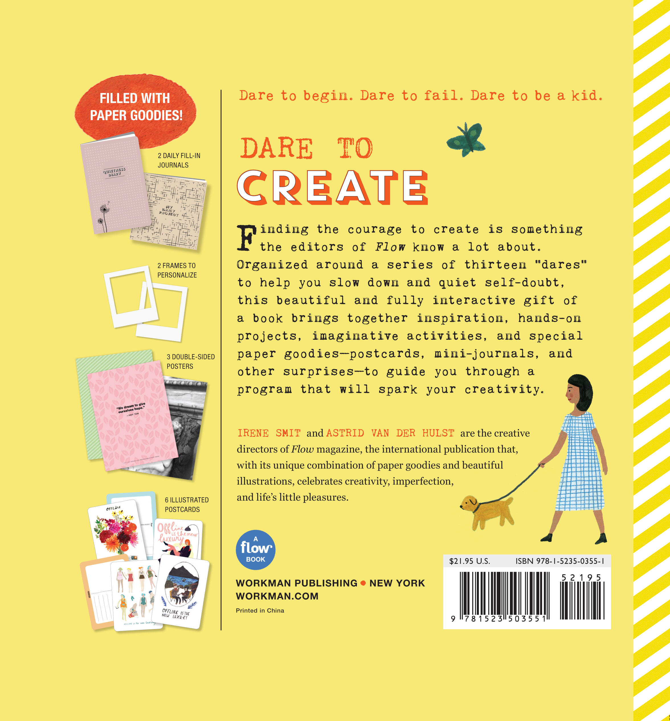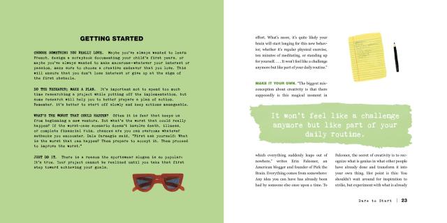 Organized around a series of twelve “dares”—including Dare to Fail, Dare to Be a Kid, Dare to Be Bored, Dare to Go Offline, Dare to Collaborate—Creativity Takes Courage encourages the reader to be fully present . . . and spend idle time staring out the window. To leave your comfort zone and start a project, without hesitation . . . and nourish yourself with museum visits and reading time. Each dare includes fill-in pages and prompts to go deeper into what motivates us or hinders us, like mindful questions to identify fears of failure, or a Dare to Commit notebook for recording both daily and weekly projects.