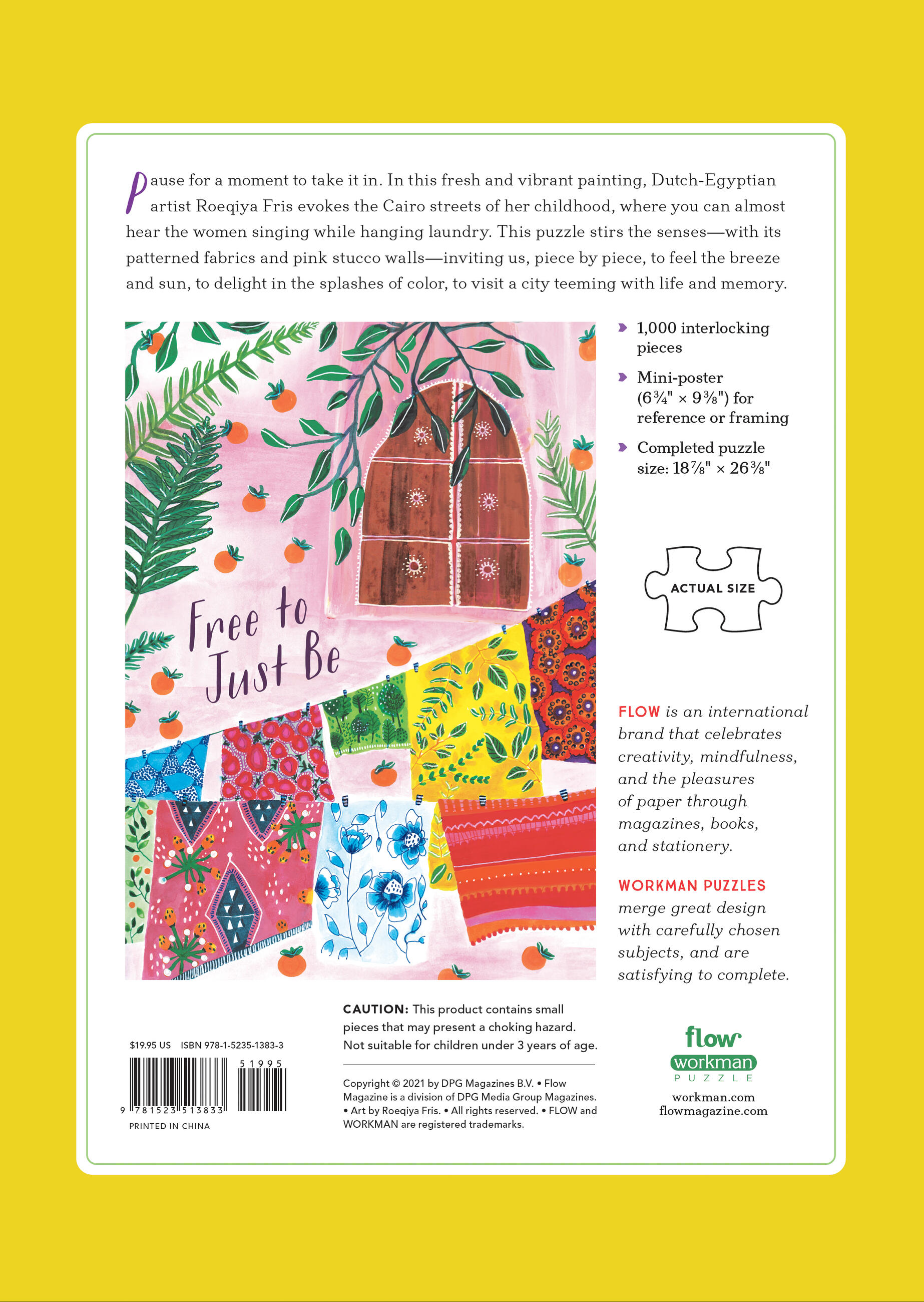 Pause for a moment to take it in. In this fresh and vibrant painting, Dutch-Egyptian artist Roequya Fris evokes the Cairo streets of her childhood, where you can almost hear the women singing while hanging laundry. This puzzle stirs the senses—with its patterned fabrics and pink stucco walls—inviting us, piece by piece, to feel the breeze and sun, to delight in splashes of color, to visit a city teeming with life and memory.