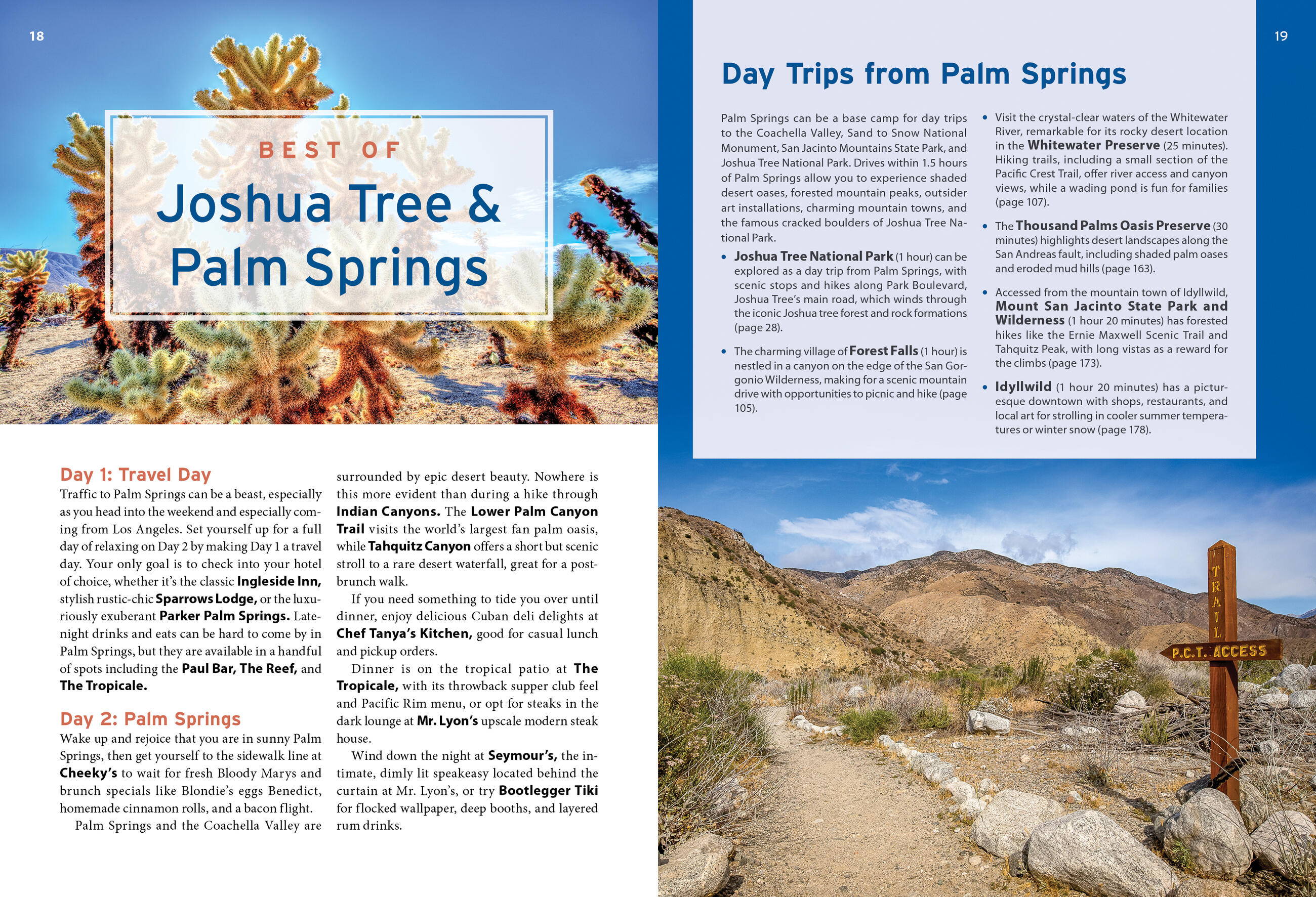 - Top activities and unique experiences: Discover hidden waterfalls, fan palm oases, and stunning canyons on a hike through Joshua Tree, or trek part of the Pacific Crest Trail on a day trip to the Sand to Snow National Monument. Try a rejuvenating sound bath or soak in serene hot springs. Admire midcentury architecture and sip retro-chic cocktails in Rat-Pack-era hangouts and sample the best of the party scene, from poolside resorts to wild west saloons