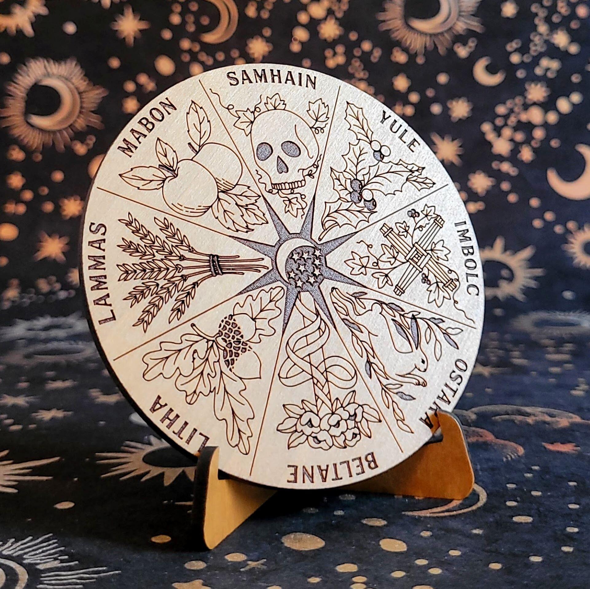 - Solid wood, etched miniature Wheel of the Year. This circular Wheel of the Year (3-1/2″ diameter) is laser etched to feature the names and symbolic representations of each of the mystical holidays (Samhain, Yule, Imbolc, Ostara, Beltane, Litha, Lammas, and Mabon).