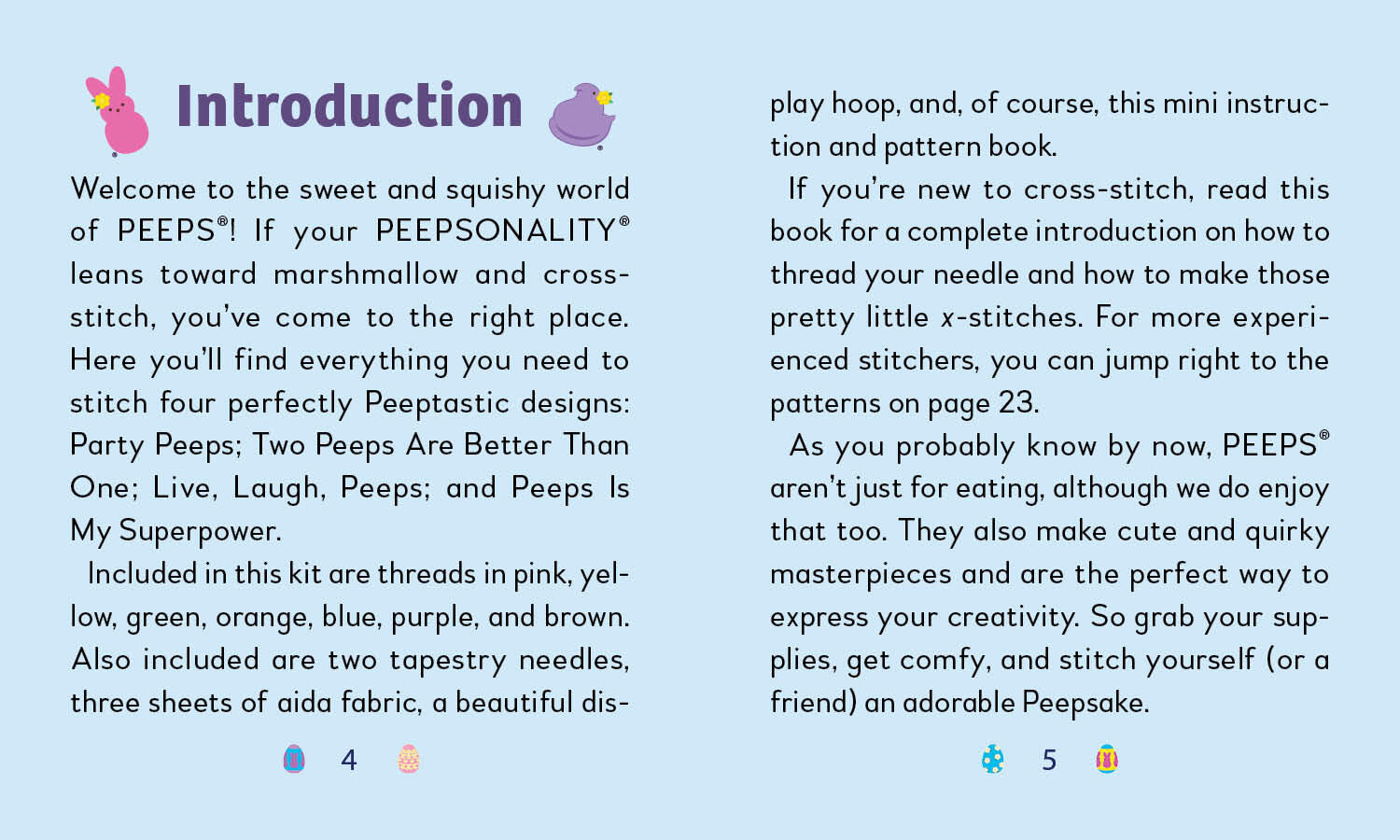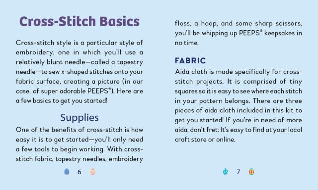 - Book Included: Fully illustrated mini book with simple cross-stitching instructions and 4 easy patterns (Party Peeps; Two Peeps Are Better Than One; Live, Laugh, Peeps; Peeps Is My Superpower)