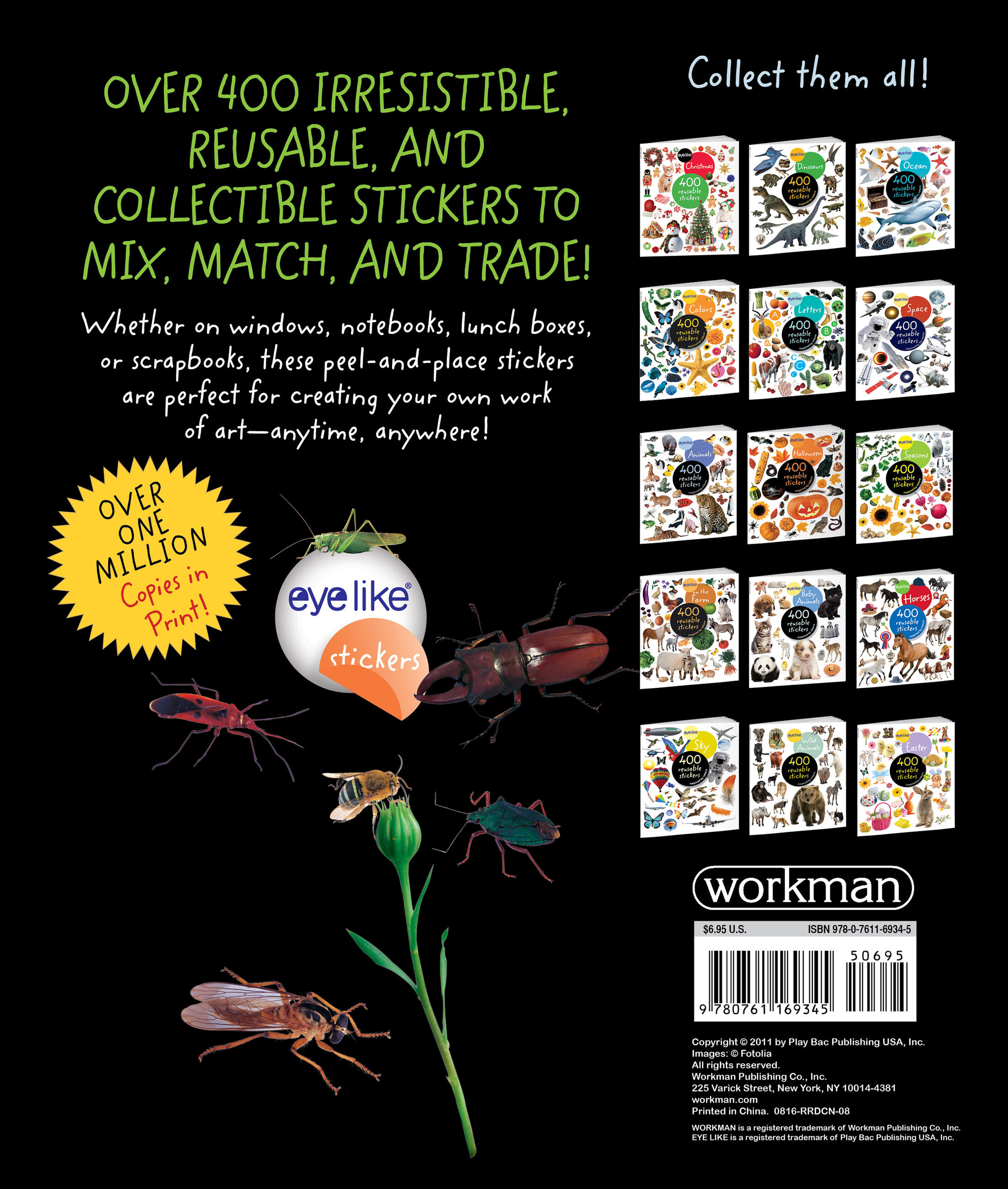 Part of the bestselling Eyelike Stickers series, Eyelike Stickers: Bugs is full of eye-catching, colorful, and photorealistic butterflies, beetles, dragonflies, and more! Whether on windows, notebooks, lunch boxes, or scrapbooks, these peel-and-place stickers are perfect for creating your own work of art anytime, anywhere, and are designed to be stuck on, peeled off, and stuck on again without tearing or losing their “stick.” The books’ inside covers are glossy illustrated backgrounds on which kids can create lively and original sticker scenes―and then change them whenever they like. Eyelike Stickers: Bugs is the perfect stickerbook for bug-lovers and nature-lovers alike!