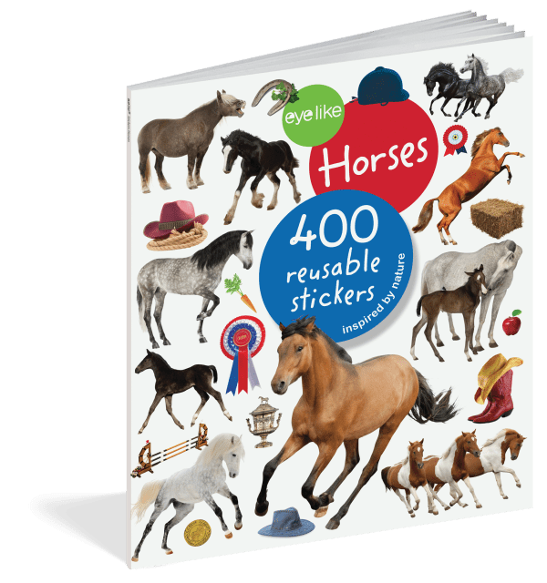 The full-color photographic stickers feature a variety of breeds in action–plus horse-themed paraphernalia like cowboy hats, horseshoes, and ribbons. Whether on windows, notebooks, lunch boxes, or scrapbooks, these peel-and-place stickers are perfect for creating your own work of art anytime, anywhere, and are designed to be stuck on, peeled off, and stuck on again without tearing or losing their “stick.” The books’ inside covers are glossy illustrated backgrounds on which kids can create lively and original sticker scenes―and then change them whenever they like.