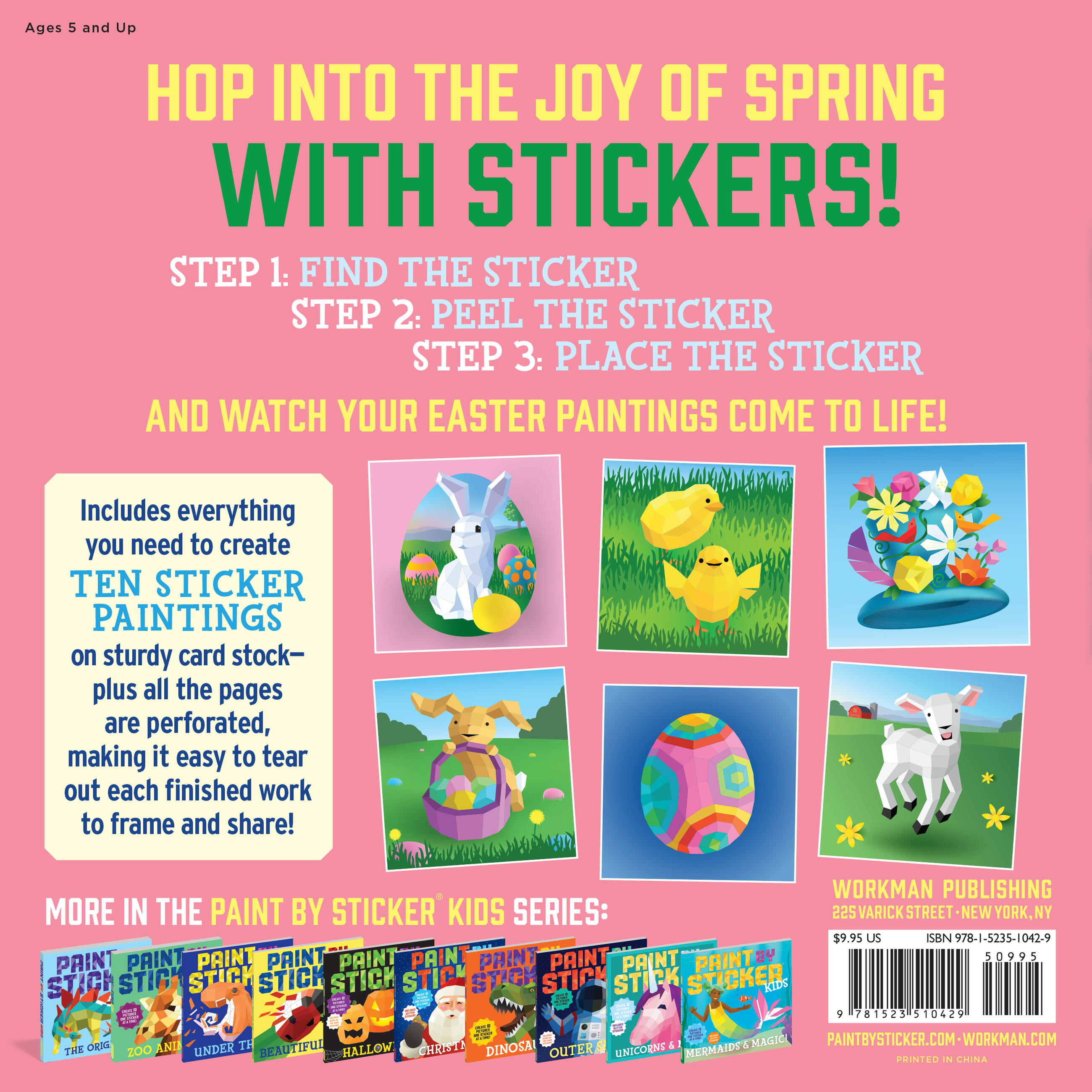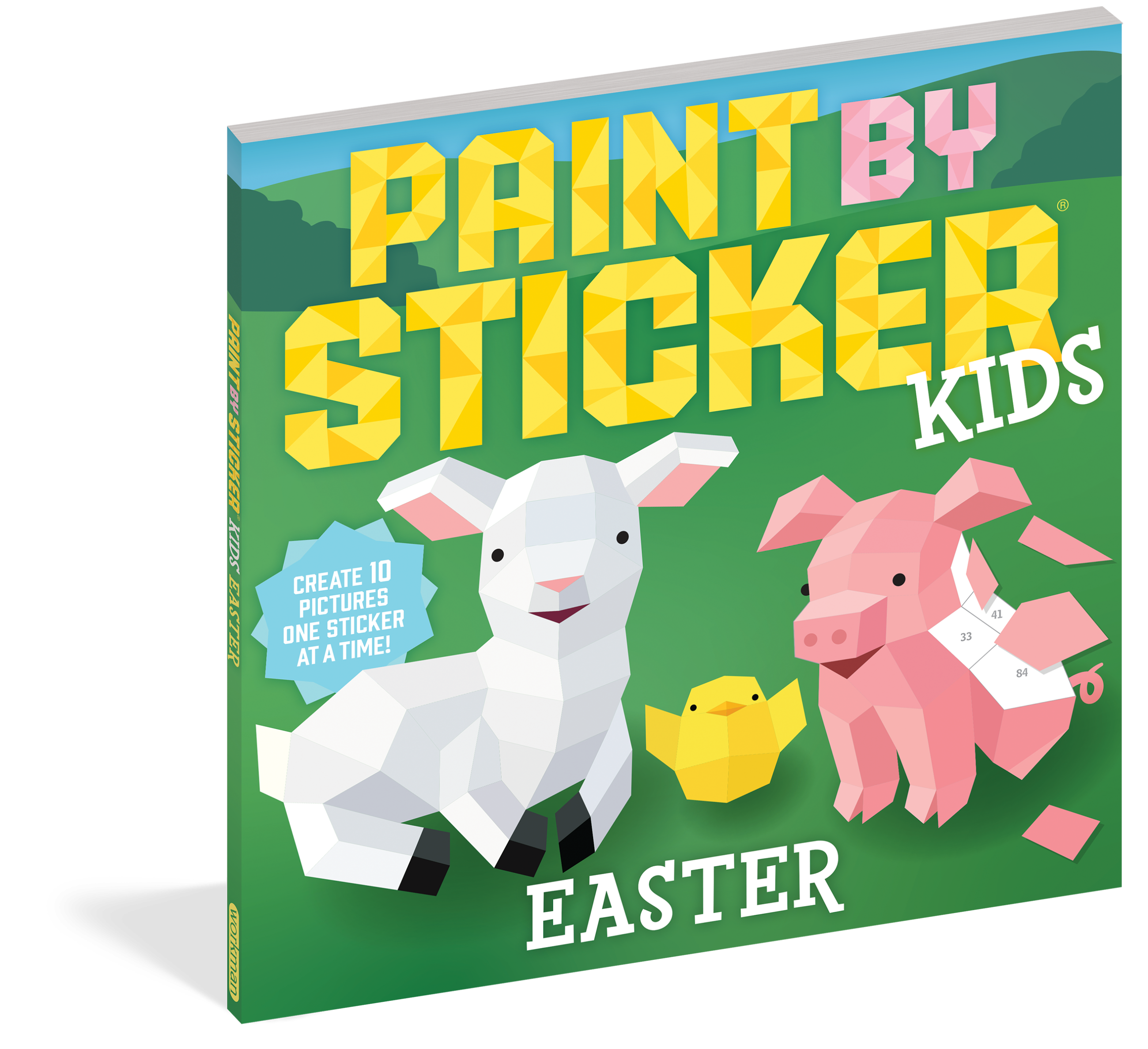 Paint by Sticker Kids: Easter includes everything kids need to create ten festive images, including a bunny with a basket of Easter eggs, a bonnet that’s packed with flowers, spring animal babies, and more!